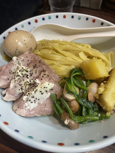 叉焼は国産豚肩ロースのレアで肉肉しい美味さ、さつまいものバター煮がめちゃくちゃ旨い‼️
