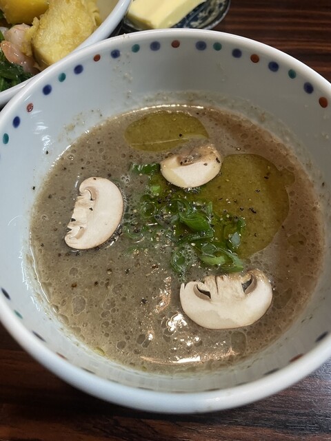 〆はスープ割り、コロチャーが入ってサラサラのマッシュルームスープ、最高でした