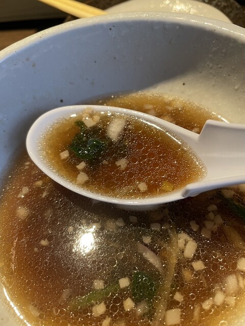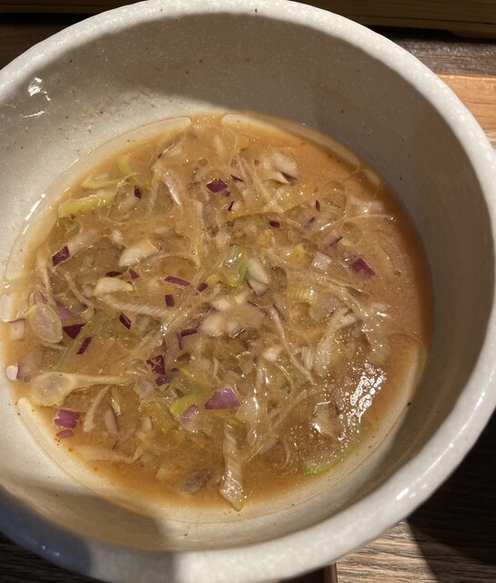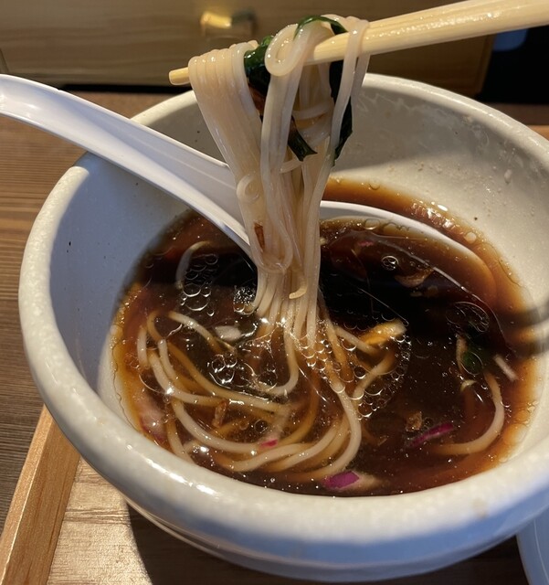 ビターな煮干満載のシャバ系のスープに付け啜る…更に旨い やや苦味、塩味があるスープは葱との相性も良く
