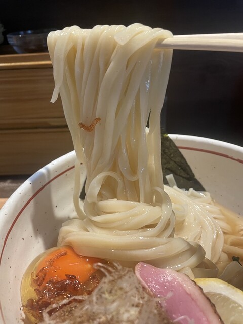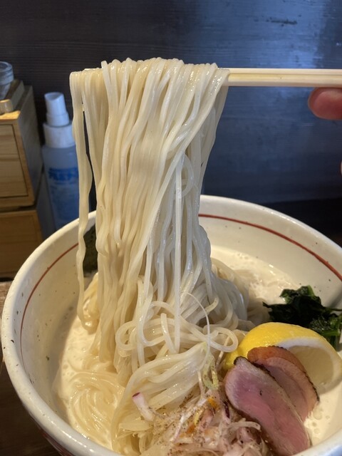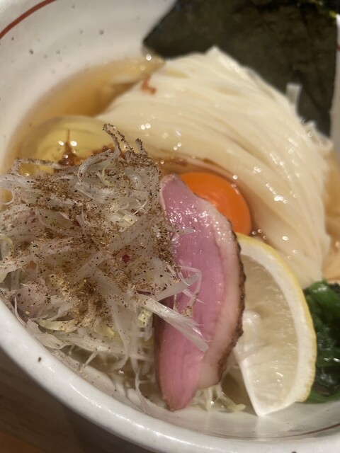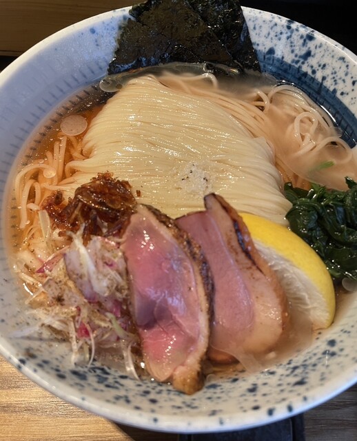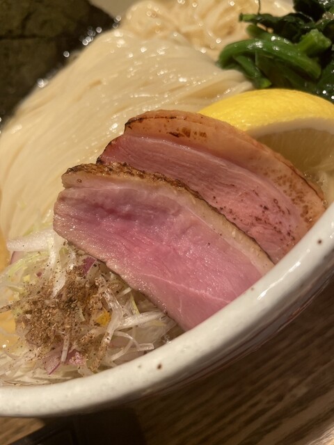 先ずはトリュフ塩をかけて秋刀魚昆布水に浸った細麺を啜る、旨い❣️ 鴨チャーシューに青菜、葱、レモンが添えられ麺線整った細麺ストレートは喉越し良く秋刀魚昆布水が纏わりつきスルスルいけます