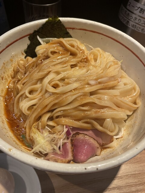 ビターな煮干しの風味、旨味に背脂が浮いた極上の漬け汁に昆布水が纏わり付いた平打ちの太麺を啜る…めちゃ旨っ❣️ 煮干しのエグ味、苦味を抑え、煮干し香るつけ汁