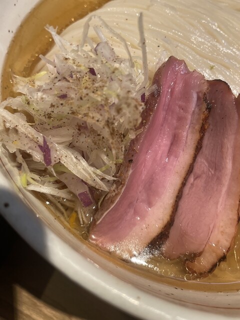 トリュフがかかった鴨チャーシューは柔らかく鴨の旨味充分です 昆布水とつけ汁に入っている葱、玉葱がまたいいアクセントになっています!