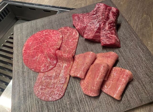 厚切りタン、薄いイカの刺身とお肉の刺身の重ね、カツサンド、どれもスペシャル。