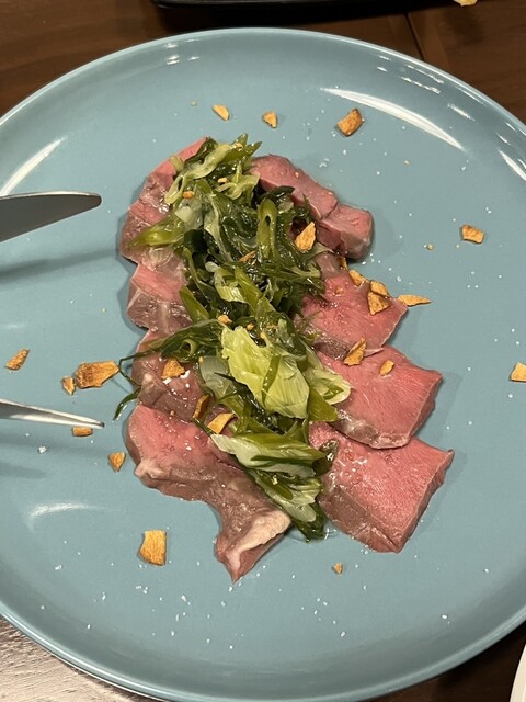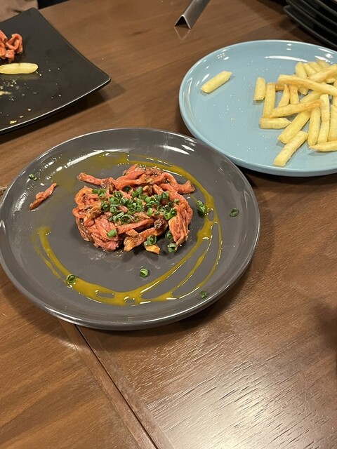 牛肉のユッケ、人数分。横に、トリュフ味のフライドポテト、すぐに消える。