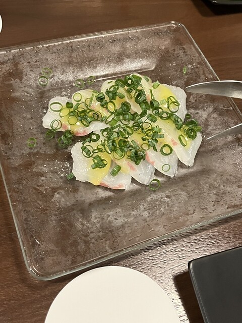 料理は、お薦めのルッコラの入ったサラダ、真鯛のカルパッチョ。段々と注文が面倒になり、その後はシェフお任せに。お腹の空き具合をシェフがヒアリングしながら、数種類の料理が並びました。残念ながら、写真撮影を失念。写真は真鯛のカルパッチョのみ。