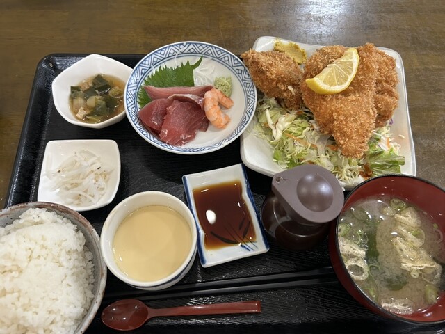 *おすすめ定食チキンカツと刺身切り落とし定食 ¥1100