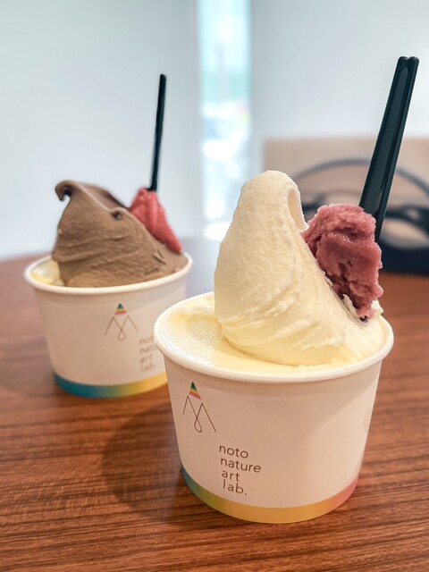 今回選んだのは、定番の「能登ミルク」と夏限定のパイン系ジェラート。一口食べた瞬間、まるでパインの果実をかじったようなジューシーさと、まろやかなミルクのハーモニーが最高でした。この組み合わせ、間違いなくまた選びたくなる美味しさでした!