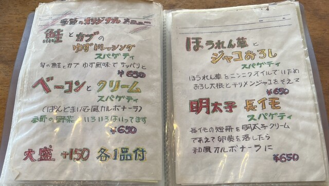 せっかくだから季節のオリジナルメニュー食べてみたかったのだけど、初めてだったし、めっちゃ美味しいの作ってくれそうな気がしたから、和風しょう油味のきの子スパゲティにしてみたよ♪