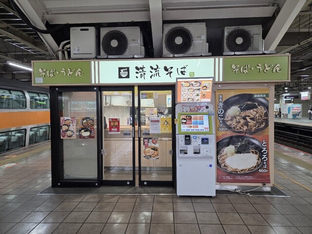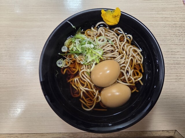 特急あずさ号を降り、そのまま同じホーム(3・4番線)にある当店に向かい、立川駅名物とされる「おでんそば」(税込540円)をいただく。おでんは、さつま揚げ、がんもどき2個、たまご2個もしくはがんもどきとたまごを1個ずつから選べる。おでんの王様(と私は思う)であるたまごだけを2個も乗せることに背徳感のようなものを感じ多少躊躇したが、やはりこれ以外の選択肢はないと決め注文。店員の方から「辛子をつけてもいいですか」と爽やかに尋ねられ、「そばに辛子…」とここでも一瞬怯んだが、「やはりおでんには辛子だろう」と思い、お願いすることとした。程なくしてそばが運ばれると、かけそばにしっかり茶色に染まったたまごが2個ごろんと乗っており、かじるとしっかり味がしみていている。たまごを食べるとむせてしまうが、そばの汁をすするといい塩梅となる。ときどき汁にとけた辛子がつんとするのはご愛嬌。もはやこのそばの主役はたまごなので、そばはあまり主張してこない、ごく普通の茹でおきの麺ぐらいがちょうど良い。ごく普通のかけそばにおでんのたまごが2個乗ることで540円にしてはずいぶん満足感が得られる一品になるなと一人唸った。接客係の男性と調理係の女性はどちらもお若く、お二人の気持ちの良い応対と手際の良さがお店の雰囲気を良くしている。