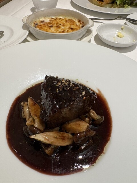 美味しいだけでなく、満足のいくボリュームと盛り付けの綺麗さに大満足でした。お肉はホロホロで、赤ワインのほろ苦さと甘味が染み込んでいました。前菜のカルパッチョは、魚介たっぷりで、ドレッシングのお味が程よい酸味でたっぷり味わえました。お魚は、皮がパリッとしていて、スープまで全部いただいちゃいました。デザートは、とろけるお味でした。外はカリッと香ばしかった!素敵なお店でした。