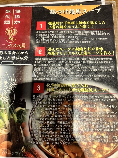 【鶏つけ麺】は科学的根拠を取り入れ凝縮した旨味の澄んだスープで、食べ続けても飽きがこず最後まで美味しいです。このひとえにあっさりとはいえないが、ひとくせがたまらない味わいは、