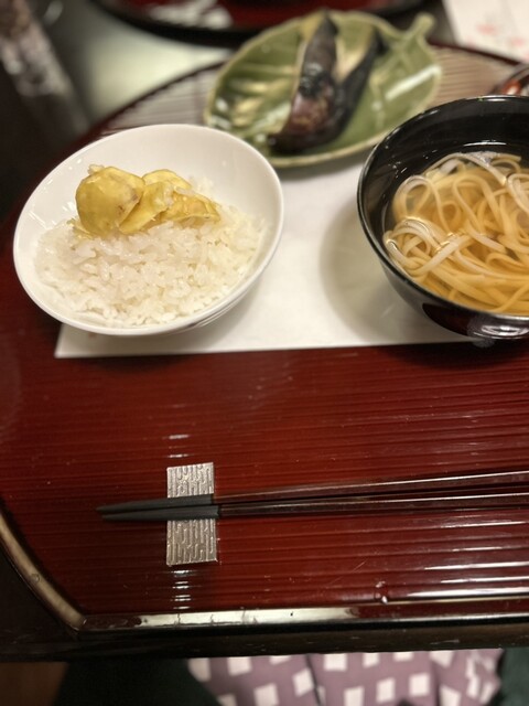 ホクホクの栗ご飯と葛うどん、水茄子の浅漬け。