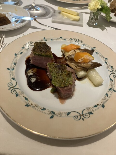 また、お料理は本格派も本格派なのに、格式ばったところがないお店で、シェフもシェアしやすいようお肉を分けておいてくれ、教えてくれたので、折角なので、妻の頼んだミルクラムのローストと私の仔牛をお互いにシェア。ミルクラムは骨つきで、ジューシーな脂と柔らかな肉質、濃厚な旨みが、仔牛とはまた違った味わいで美味しかった。妻共々、お互い、メインを選ぶ際にかなり迷ったので、心配りがとても嬉しい。以前インタビューで、お店はそれぞれお店ごとの役割があるとシェフの記事を拝見したが、フレンチでこういう体験ができるのは初めてで、シェフの大事にされているものが伝わり、より心地よく感じた