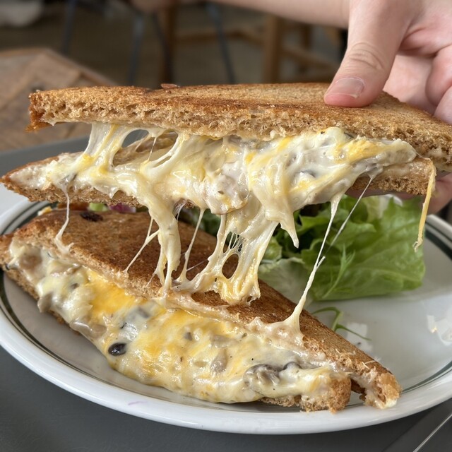 カリッと焼かれたトーストの間に、とろっとしたチーズやホワイトソース、キノコ、ベーコンなどがサンドされています。焼き加減や味、食感などの組み合わせが良く、病みつきになります