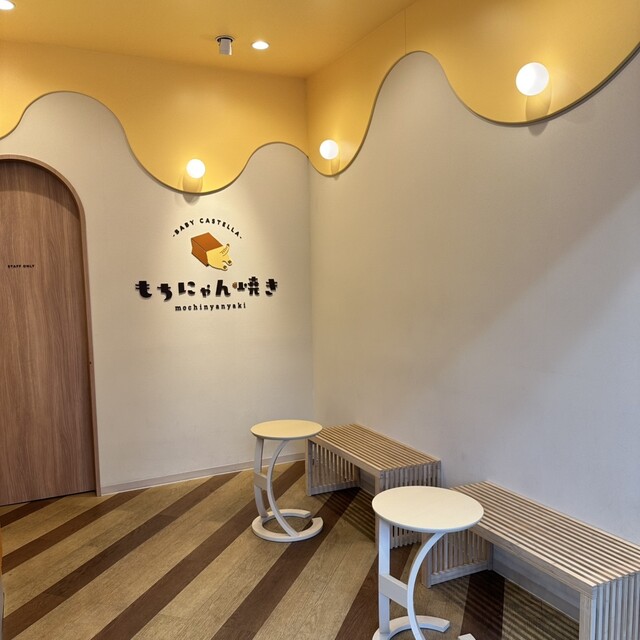 「もちにゃん焼き」の看板や「ベビーカステラ専門店」と書かれた大きな看板が目印です。