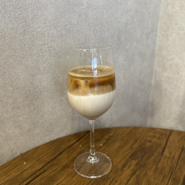 ワイングラスにコーヒーとミルクがおしゃれに2層に分かれて注がれています。