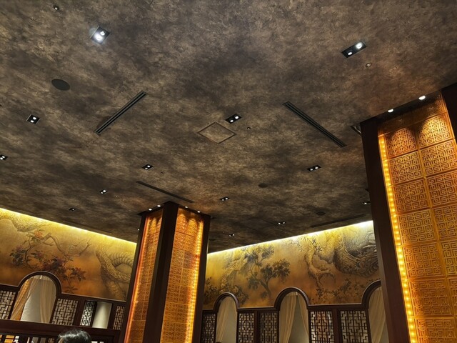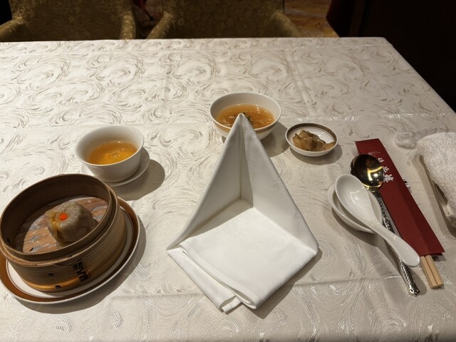 フカヒレ専門店であるこのお店の入り口にそびえるのは巨大なフカヒレ。階段を下ると宮殿の入り口のようなゴージャスでありながら品の漂う空間が迎えてくれます。天井も高く、開放的で銀座散策の疲れもどこへやら。夜は数万円するとのことですが、ランチはお手頃なのが本当にうれしい!