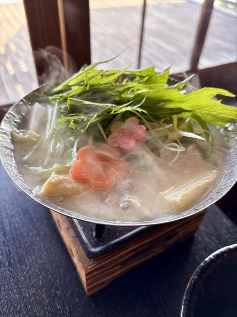 京都市役所から歩いて5分ほどの京都らしい路地の突き当たりにある鴨川に面する割烹です。夜はそこそこのお値段のお店です。お目当ては白味噌鍋ランチ1,890円(プラスサービス料が別途かかります)。