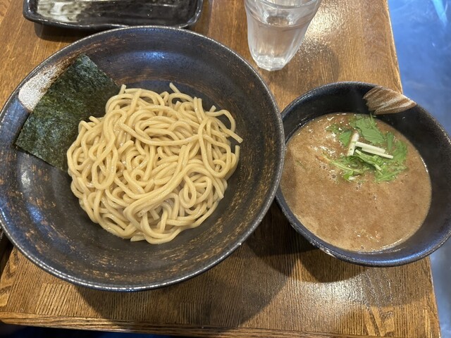 つけ麺は本当に濃厚。チャーシューがとろとろ、メンマ柔らか、水菜はシャキシャキで具材も美味しい。麺は太めでもちもちでスープとよく絡み付きました。