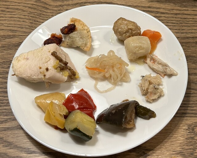 メニューはパスタやグリルなど色々ありましたが、ちょうどこの日の日替わりパスタが、トマトとミートボールのパスタで、カリオストロの城だ!と思ってそれを注文。すべてのメニューに前菜ブュッフェがついていて、ドリンクも飲み放題!種類も多くて、ちょこっとずつ食べました。一通り食べましたが、ナスの炒め物が1番美味しかった!