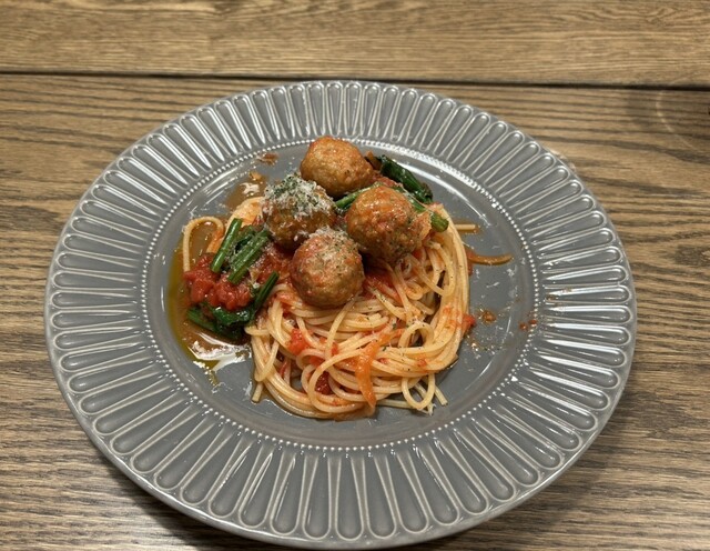 メインのパスタはトマトの酸味が強かったですが、上品な味で美味しかったです。ミートボールゴロゴロで美味しい!