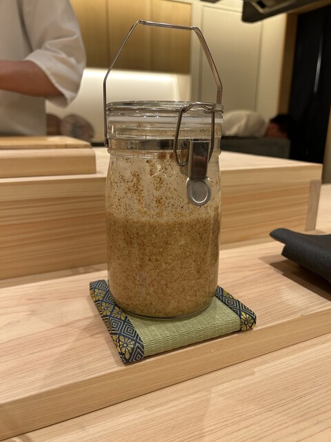 プリンを食べている間にとても良い音がして‥この後の藁焼きとともにパフォーマンスもとても光るお料理でした。そして、私がお部屋に置いてあって気になっていた瓶は、なんと自家製の辛子麹!余ったシャリをおもゆにして加えているそうで予想外‥!