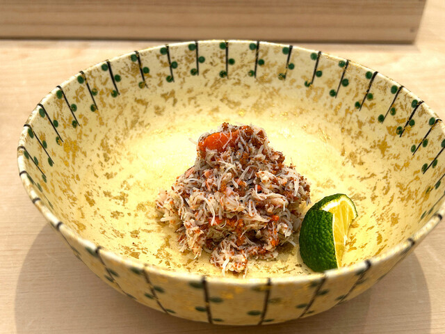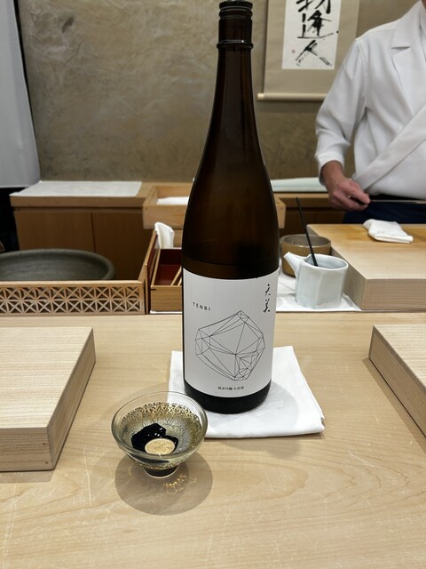 背の高い大きな扉に導かれ、こぢんまりしながらも解放感のある素敵な店内でした。おまかせコースとともにペアリングで。日本酒をベースに、時折ワインを挟んでいただき、とてもバランスがよくて楽しい時間でした。