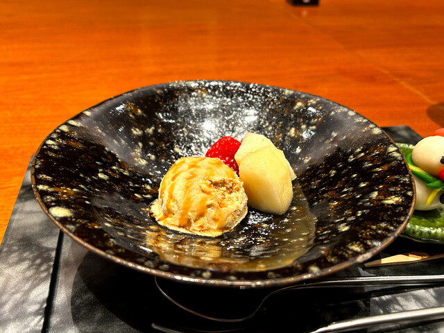 汁物のお肉はすきやきや鍋などかな、と思いましたがお椀で出てきた小鍋はあつあつでとても美味しかったです。黒毛和牛のほか、ネギや舞茸、お餅などの具材もしっかり入っていて、どれも味がしみしみで贅沢‥!黒毛和牛の出汁がたっぷりのつゆまで含めてとても美味しかったです。
