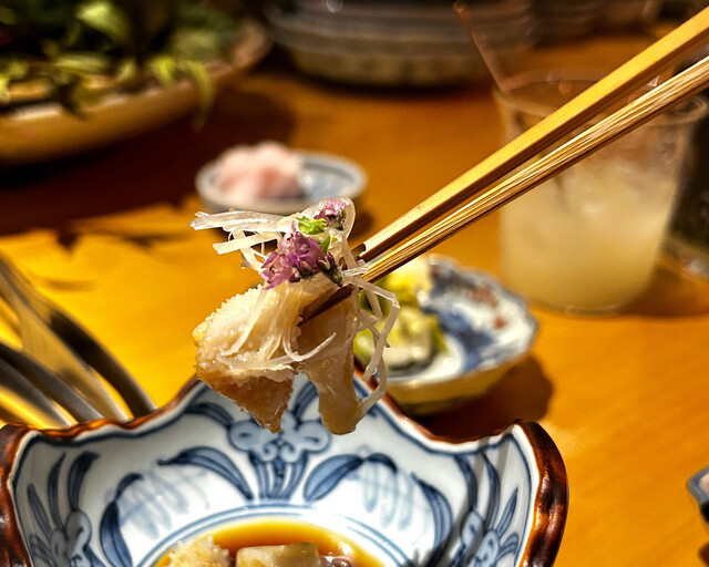 コースの幕開けはほんのり甘味のある『白菜りんご酢漬け』。酸味の強くない、つい箸が進むお漬物でした。テンポ良くやってきた千枚刺しは、真っ白で見たことのない見た目!生ポン酢を合わせて優しい酸味とコリッとした食感が大好きです。