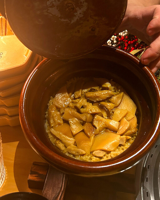 ハツ刺しには緑が綺麗な九条ネギと黒七味だれをあわせてスパイシーな大人の味わい。網の上には、土鍋がスタンバイされていて、コース開始時から非常に良い香りが‥この日はポルチーニ茸の土鍋ご飯でした。開けた瞬間のポルチーニの芳醇な香りに攻撃され、早速いただきました。締めとしてではなくコースの始まりからご飯がいただけるのは新鮮で個人的にはとても嬉しい♡ご飯とお酒を一緒に食べられるタイプでよかった〜!!