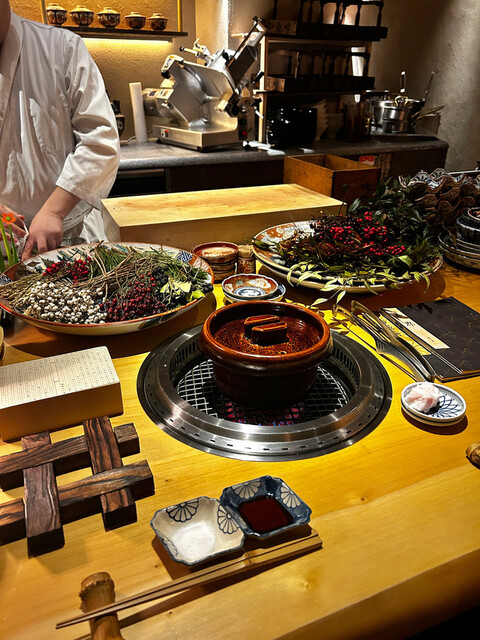【六本木一丁目×焼肉】六本木一丁目駅から直結のアークヒルズサウスタワー内に新しくオープンした名古屋の名店!重厚感のある目立たない扉が隠れ家感たっぷりで入店からドキドキ。靴を脱いで扉を開けると、カウンターが広がっていてなんだか想像と違う!良い意味でごちゃごちゃした趣のある店内が独特の世界観でとっても素敵でした◎お皿一つとってもすごく可愛くて、空間が心地よいです。