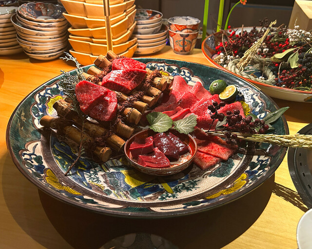 白蕪の擦り流しとさがり刺しを挟み、いよいよ大皿焼肉が。