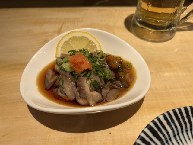 先出しはアンコウ?の唐揚げ。ハタハタの刺身、とらふぐの白子焼き、イワシの刺身、小エビの唐揚げを注文。