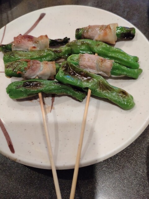 アスパラ巻きの部分とアスパラのみ部分が串にささっています。アスパラ巻きは一味で→アスパラは塩で