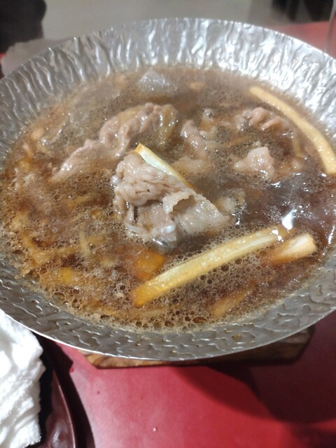 出汁が効いたすき焼きタレで煮込むといい香りがしてきた〜。出汁の効いたすき焼きタレからお肉を取り出し→半熟卵につけて食べる。お肉が柔い2〜3回噛んだら溶けてなくなった〜。これは赤ワインでしょう!