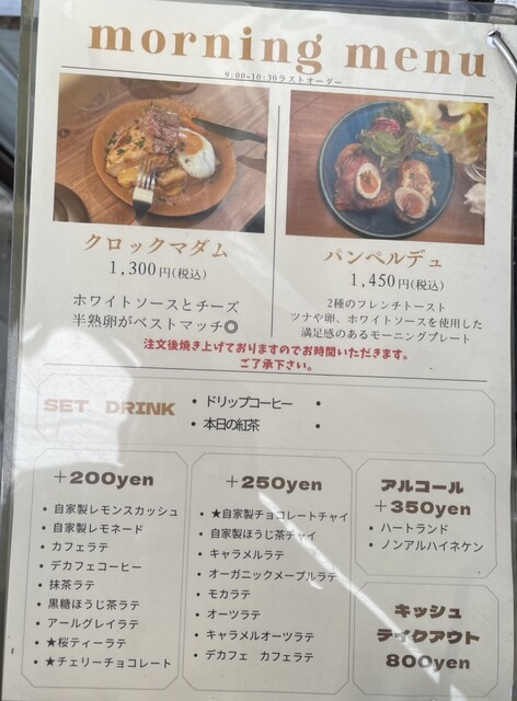 今回のモーニングセットのメニューは、パンペルデュプレートとクロックマダムプレートの2種類。セットドリンクもついています。