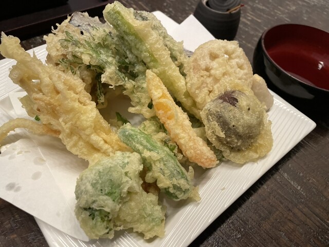 『野菜天ぷらの盛り合わせ』は、思っていた以上に沢山の野菜がありました。ブロッコリー、シシトウ、パプリカ、えのき、椎茸、舞茸、レンコン、アスパラガス、かぼちゃの10種。2人でシェアして十分な量です。お塩も貰ったので、天つゆと塩の味比べでいただきました。