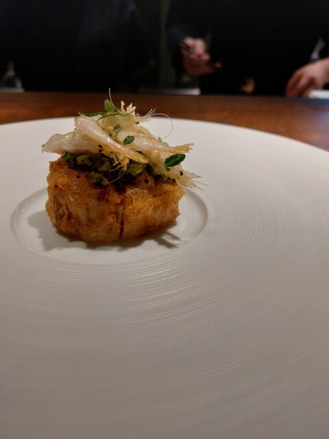 大きめに切った筍をフリットにして、ブロッコリーなどで作ったソースと、素揚げにした白海老を合わせた品。個人的にはもう少し筍が少ない方がいいかなと。ですが揚げられた筍は柔らかく香りもよかった。そこにブロッコリーのソースと、白海老の相性が良くとても美味しかった。