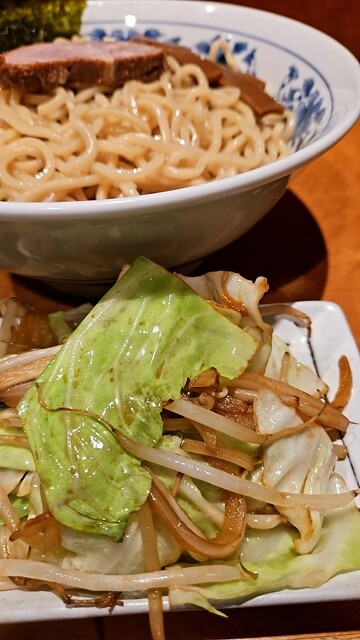 流行りのつけ麺とは程遠い味ですが、火傷しそうな熱々の少し酸味がある魚介スープと程よい太さの綺麗な麺とチヤーシューと言うよりヤキブタと言う言い方が似合ってるお肉、焼き野菜はキャベツがシャキシャキして少し甘味のある味付け。