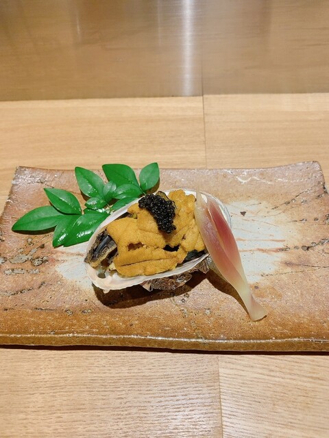 あわびの殻にあわびとうにを乗せて焼いて、キャビアを乗せて出していただき、あわびの肝しょうゆを別で出していただきました