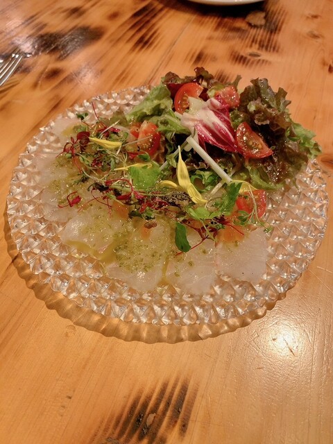 カルパッチョは鯛の刺身にバジルの風味といくらのプチプチ感と塩分が合わさって、めっちゃ美味しかったです
