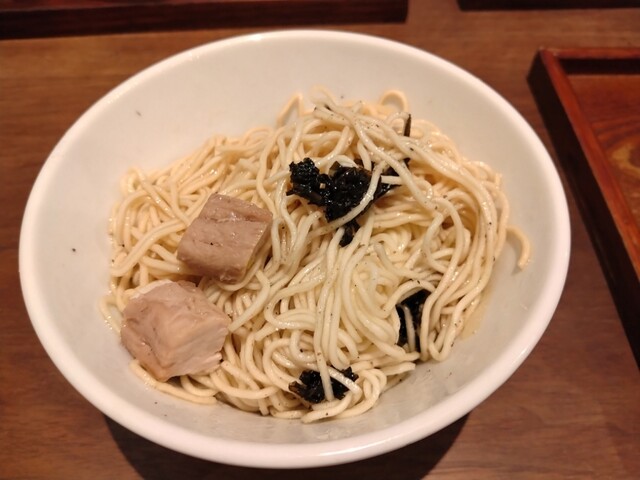 あえ玉様もキャット到着。グルグル和えます!このあえ玉キャット様の細麺がちょっと硬まる感じの食感で、モチモチ具合がラーメンとはまた違い、なんか生パスタじゃないんだけど、美味いよな〜。