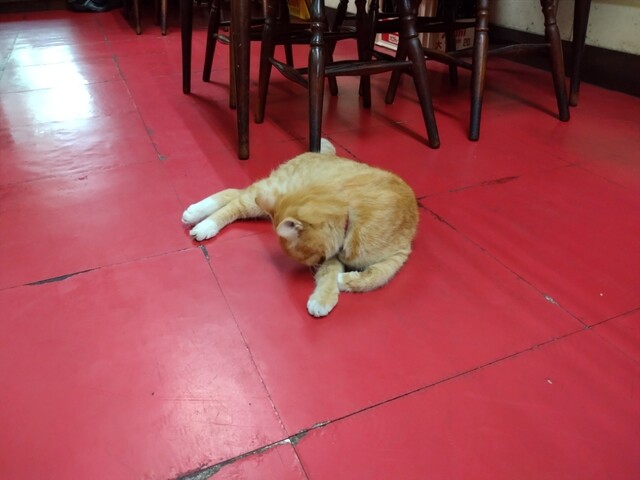 ニャンてやってるうちに、近所の常連さん達が続々入店。18:30頃にはほぼ全テーブルが埋まりまして、最後の婆ちゃん、ママ、女の子の3人組がマロン様のいる最後まで空いていたテーブルへ。猫ちゃんいるから静かにねと婆ちゃんが言ってますが、マロン様反応。成程、触られても、いじくられても、写真撮られても気にしないが、テーブルに人が座ると嫌なんだ。(笑)