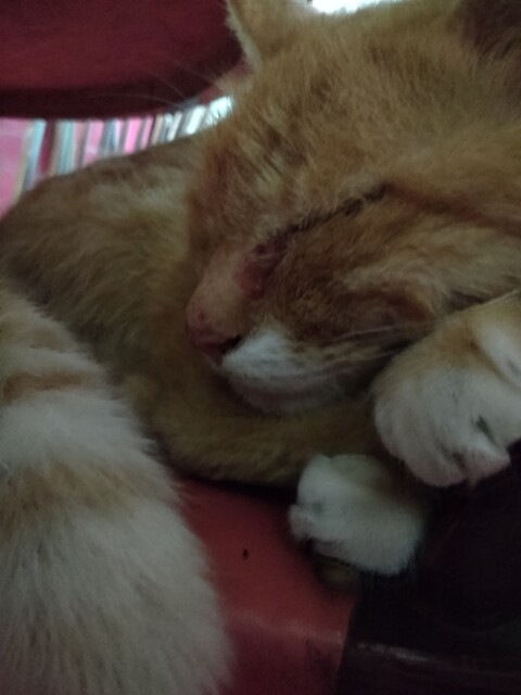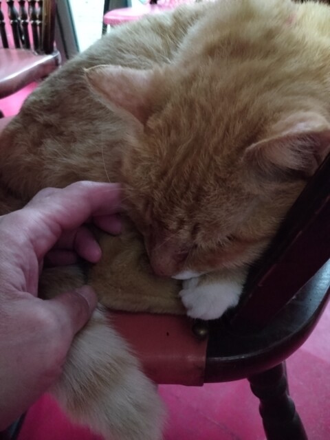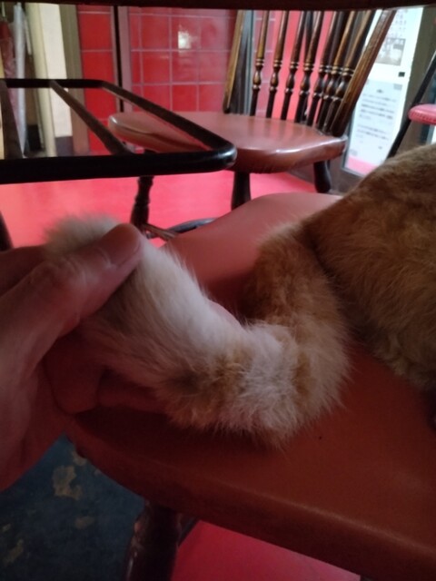 テーブルに戻って乾杯していると、マロン様がまた入口すぐのテーブルの椅子に戻って来てスリーピングモード!マロン様の定位置のようですね。もちろん撮影チャンス。まずはマロン様鼻enlargedキャット!そして尻尾。そして撫で撫で☆起きない。
