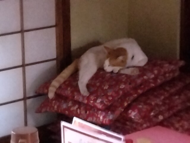 小上がりの窓からまだ明るい公園が見えて、中々イイ風情ですね☆ と、思いったら、小上がり奥の座布団の上にキャット反応!いた、コロン様☆コロン様も寝てはります! うお〜凄い☆看板猫ツーキャッツ揃い踏みニャン☆