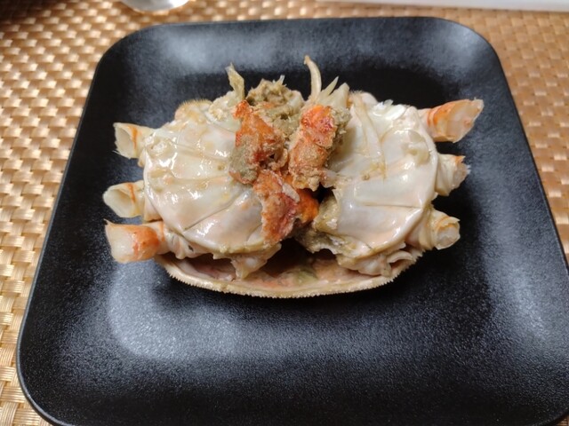 て、やってると、フード第一弾到着!か、蟹さんだがや〜。こ・れ・は…アレで日本酒を呑めって事やんな。いや、それしかニャい!サーブのお皿ではトムキャットだが、小皿に移してラプター仕様、それではキャノピーオープン!ここにぃ〜純米大吟醸神渡様をニャみニャみ注いでぇ〜乾杯ぁ〜い…マイウ☆これは…アカン、めっちゃウマいニャン☆神渡様もあっという間に無くなって、兎マークの澤の花 様にチェンジキャット☆