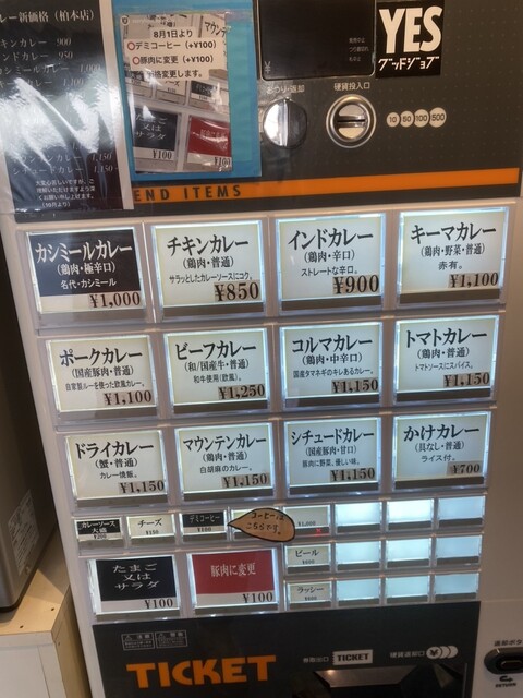 券売機でインドカレー900円、ラッシー600円、口頭でサービスのピクルスを注文、さらに食後のコーヒー100円を追加注文