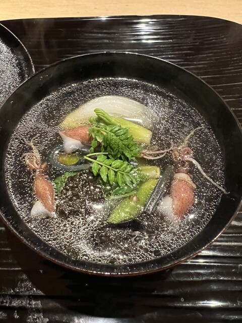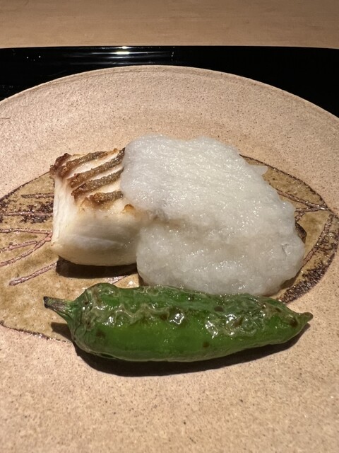 とにかく出汁のパワーが凄い。この料理の出汁が一番美味しく印象に残っています。とにかく麩から出てくる出汁のうまさは格別でした。葱と大根もほどよい食感で最高の炊き合わせでした。