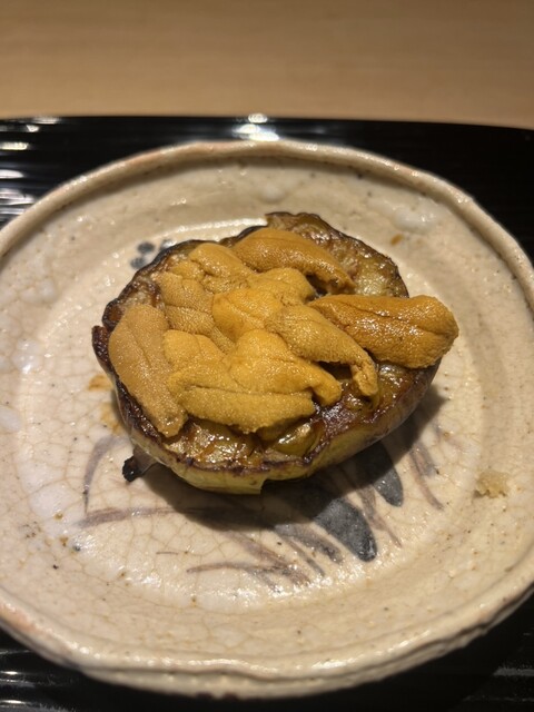 7皿目は焼きナスにウニ乗せ。焼きナスのトロトロとウニの甘味うま味で幸せでした。野菜で茄子が一番好きなのでウニのせで言うことなし。
