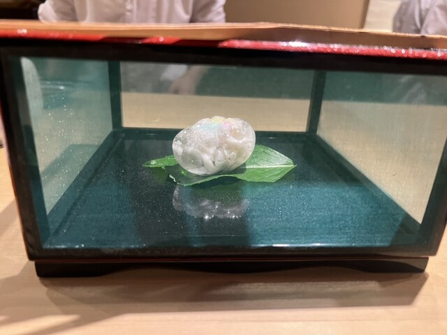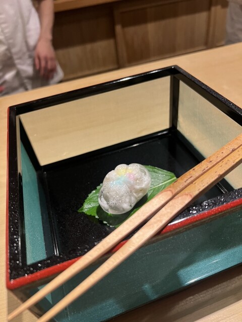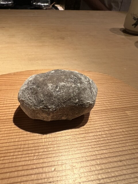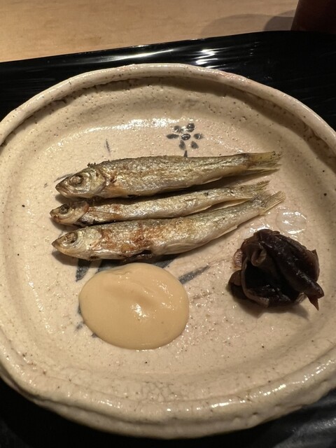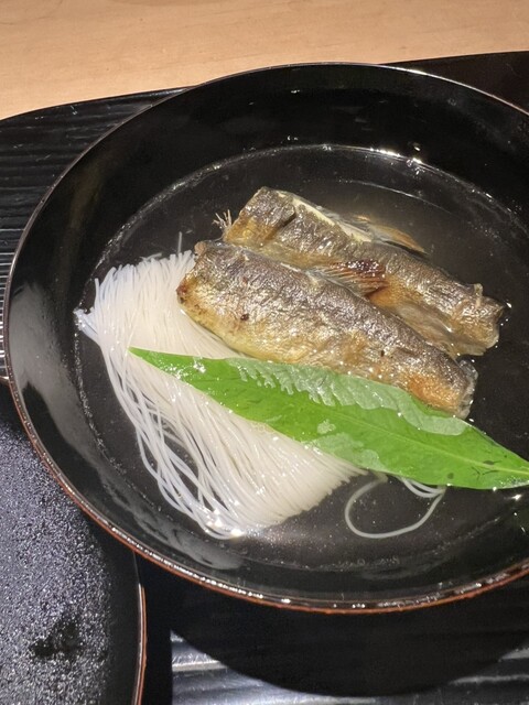 稚鮎からすこし成長したかなくらいのサイズでした。脂のりが良く、目の前で炭火焼されているのですが、煙が凄く出ていました。それの煙を程よく内輪で仰ぎ飛ばしていい塩梅の焼き加減にて提供されました。